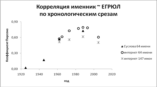 Рисунок 1 .Корреляция именник ~ ЕГРЮЛ в диахронии.