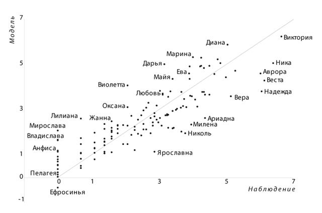 p Beta St. Err. Beta p Beta St. Err. Beta Intercept 0,03 Intercept 0,00 92-94 0,00 0,50 0,07 92-94 0,00 0,44 0,08 Theo 0,00 0,38 0,05 Theo 0,00 0,41 0,05 63-67 0,00 0,27 0,07 63-67 0,03 0,17 0,08 Sema 0,00 0,29 0,05 Sema 0,00 0,22 0,05 Ino 0,00 0,33 0,05 Multiple R Multiple R2 Adj R2 p Multiple R Multiple R2 Adj R2 p 0,85 0,73 0,72 0,00 0,81 0,65 0,64 0,00 В рамках модели не оказывают значимого влияния на частоту появления в ЕГРЮЛ следующие факторы: число букв и слогов в имени, номер ударного слога с конца, наличие «неблагозвучных» букв ж иф, возможность использовать имя как комбинацию имен (НиКа = Николай +Катерина) или гипокористику другого имени (Лана < Светлана). Имена популярных святых (Татьяна, Ксения…) также не отличаются значимо по частоте от остальных. Не дали результатов и попытки учесть прецедентность имен путем подсчета запросов типа «певица Х» или «актриса Х» к системе Яндекс. Наблюдаемыеи предсказанные моделью частоты ЕГРЮЛ показаны на Рис. 2.
