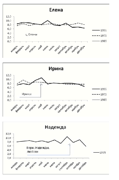 Для имени Наталья на срезах 1975 и 1995 можно говорить о небольшом повышении частоты в сентябре (день мч. Наталии): 10% против 8% в остальные месяцы; в 1985 году заметного изменения частоты в этом месяце нет. На срезе 1995 года имена Елена, Ирина и Ольга показывают повышенную частотность в месяцы, на которые приходятся дни памяти соответствующих святых.
