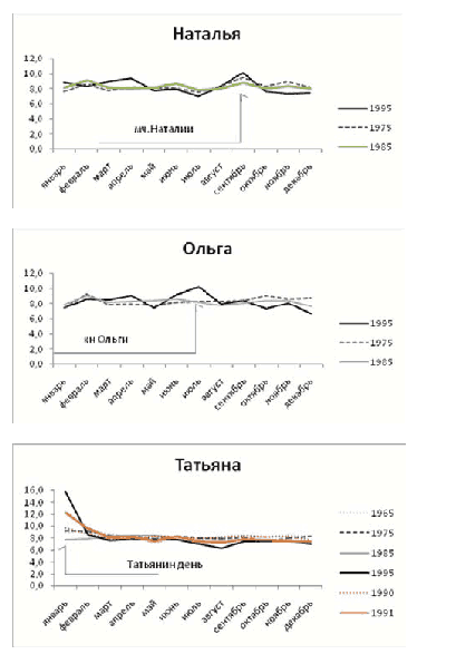 Имя Татьяна показывает в советское время равномерные частоты в течение года на срезах 1965–90 гг., а с 1991 года начинает расти январская частота, достигая в 1995 году 16% против средних 7% по оставшимся месяцам.