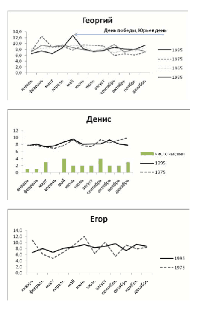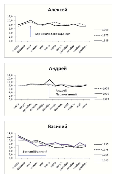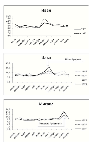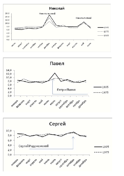 Некоторые мужские имена обнаруживают тесную связь с церковным календарем даже в советское время. Василий в январе, Алексей в марте, Павел (но не Петр) в июле, Илья в августе, Михаил в ноябре на срезах с 1965–95 года показывают заметное повышение частоты. Имя Николай дает два пика частотности, в мае и декабре, что соответствует дням памяти Николая Чудотворца. Имена Денис и Егор дают ровную помесячную динамику частоты имянаречения, Андрей и Сергей показывают повышенные частоты в месяцы, отмеченные днями памяти соименных святых, лишь в 1995 году.