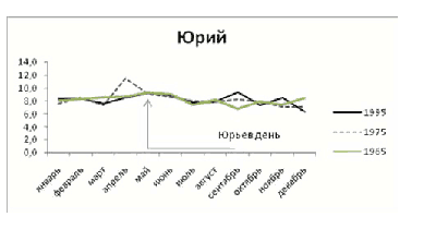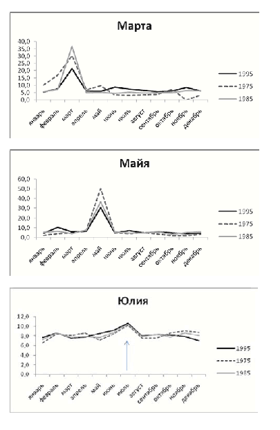Оказалось также, что имена, схожие с названиями месяцев, показывают максимальную частоту рождений в этом месяце. Имя Юлия имеет 10–11% носительниц, родившихся в июле, против среднего по остальным месяцам 8% (срезы 1975–95 гг.). На тех же срезах имя Майя имеет частоту в мае от 31 до 50% (среднее по остальным месяцам 4–6%). Схожая картина выявлена и для имени Марта в марте. Имя Яна показывает повышенную частоту в январе только на срезе 1995 года (15% против среднего 8% по оставшимся месяцам).
