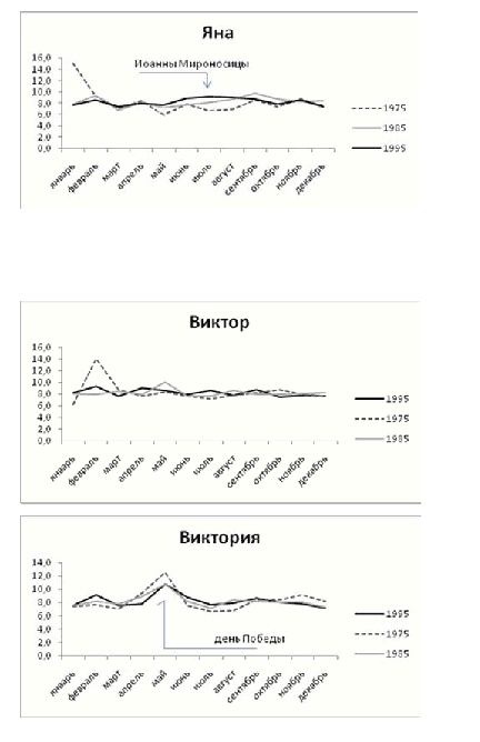 Интересно, что имя Виктория дает повышенную частоту в мае (11–12% против средних 8%), что связано, видимо, с днем Победы. Для имени Виктор майского подъема частоты не наблюдается.