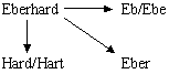 Характерной группой образования дериватов по принципу объемности является отсечение в исходном имени его начальной или конечной части: Joachim>Jo, Achim; Eberhard>Eb/Ebe, Hard/Hart. Возникающий вследствие такого сокращения объемный деривационный ряд репрезентируется обычно двумя, как правило, инициально-финальными сокращениями.